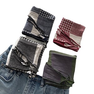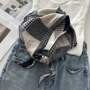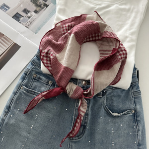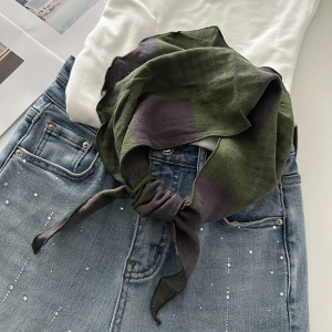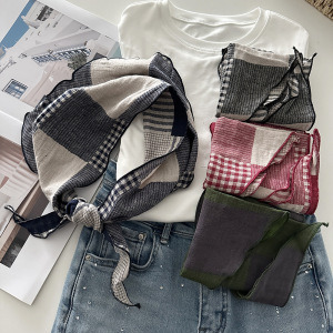 文艺复古双面双层格子围巾女亚麻撞色三角巾拍照头巾服饰搭配丝巾
