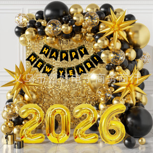 跨境新款2026黑金新年气球拱门套装 含新年快乐拉旗横幅跨年装饰