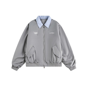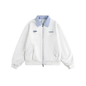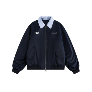 美式复古假两件刺绣条纹撞色翻领夹克男女学院风宽松休闲工装外套