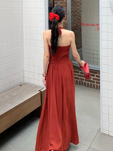 2025新款法式复古红色挂脖吊带连衣裙女夏季海边度假气质收腰长裙