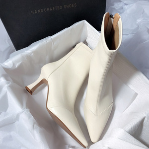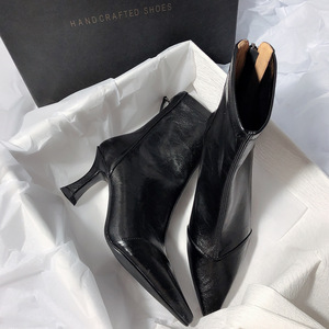 新款尖头优雅韩风心动瘦瘦靴细跟后拉链全皮高跟短靴女