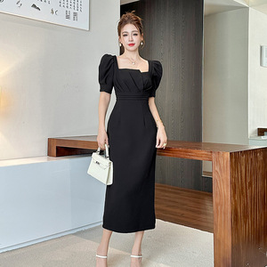 2025夏季新款法式复古赫本风褶绉设计黑色连衣裙正式场合裙子9011