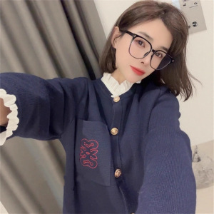 一件代发法单S家修身荷叶边木耳边可拆卸领刺绣针织长袖开衫外套