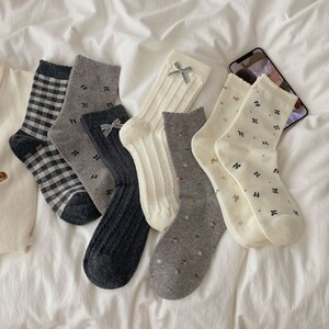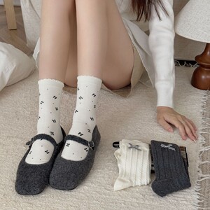 韩系玫瑰ins日系复古少女立体蝴蝶结袜子格纹中筒袜肌理感堆堆袜
