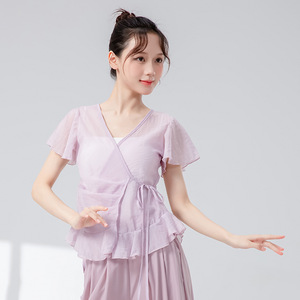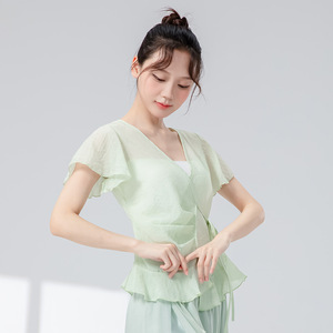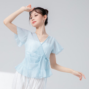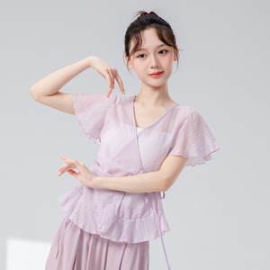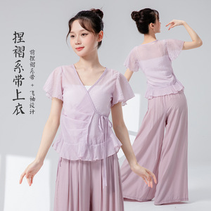 古典舞纱衣新款飞袖前捏褶系带上衣飘逸训练形体服练功舞蹈服上衣