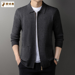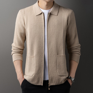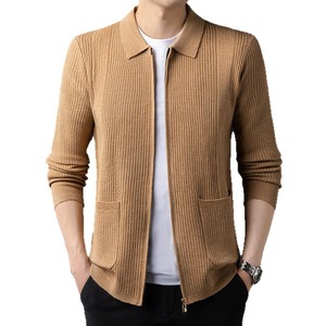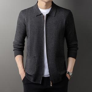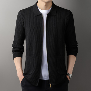 秋冬季男士拉链翻领长袖针织开衫夹克真口袋针织纯色毛衣外套