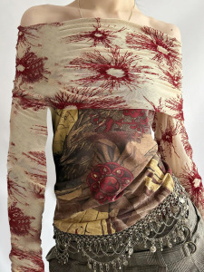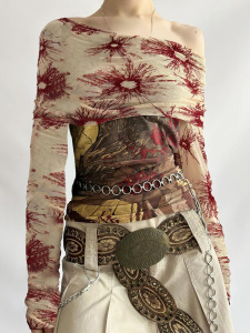 欧美小众复古古着感印花撞色翻领网纱拼接一字肩修身长袖T恤上衣