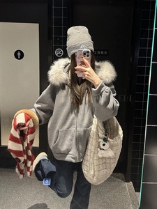 大毛领连帽卫衣加绒加厚外套女装2025秋冬季宽松慵懒短款休闲上衣