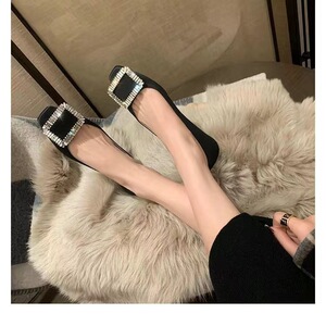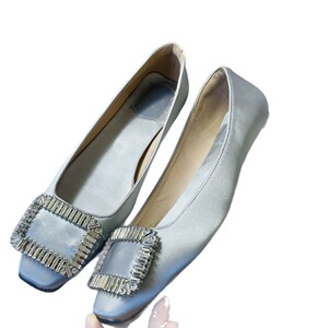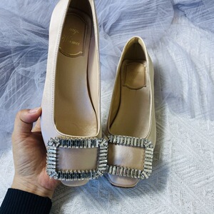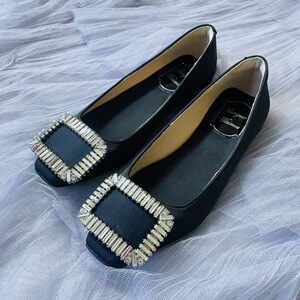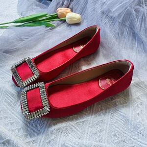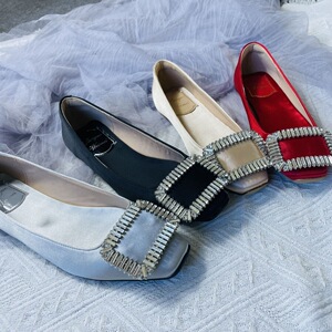 鼎版欧美RV钻扣平底鞋真丝绸缎水钻方扣内增高方头浅口单鞋女婚鞋