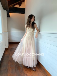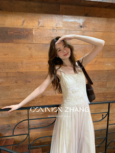 CZ ZHANG秋纱网蕾丝绣花拼接高腰A字大摆名媛吊带连衣裙B36212
