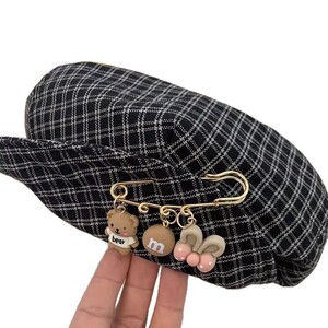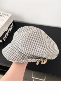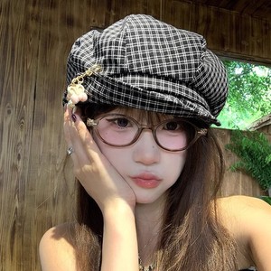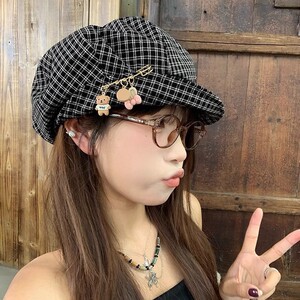 日系可爱小熊黑色格子贝雷帽女夏季文艺百搭显脸小报童帽子画家帽