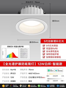 【全光谱防眩筒灯】白杯-12W-智能调光调色-75开孔