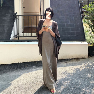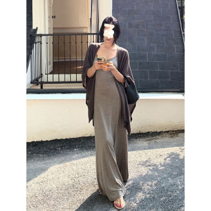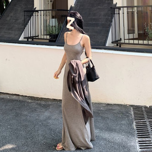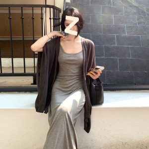 慵懒休闲套装灰色吊带连衣裙纯欲风长裙女夏季气质披肩外套两件套