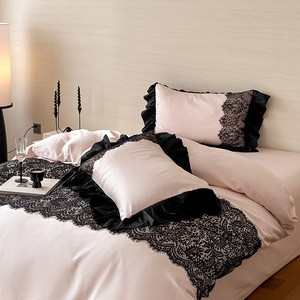 法式蕾丝全棉长绒棉贡缎床上四件套粉色被套床单公主风高级感床品