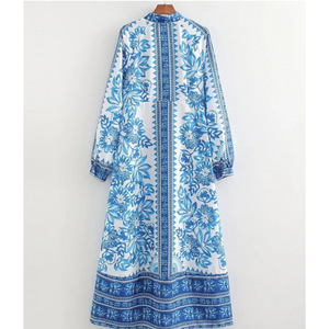 速卖通跨境外贸欧美女装2025夏季爆款印花单排扣V领度假风连衣裙