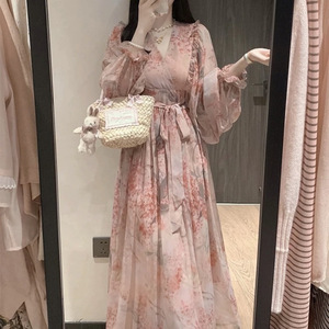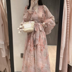 300斤大码微胖mm粉色碎花法式V领气质收腰显瘦海边度假风连衣长裙