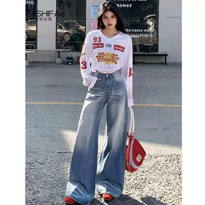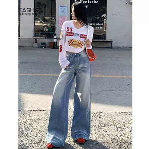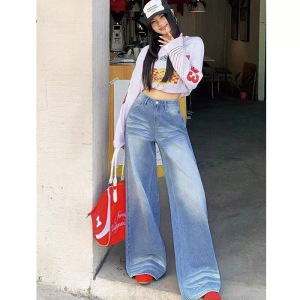 蓝色设计感水洗高腰直筒牛仔裤女2025春季小众百搭宽松阔腿长裤子
