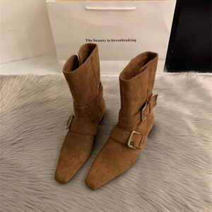 2025年韩版新款小众设计复古法式短靴方头西部靴中筒靴女马丁靴子