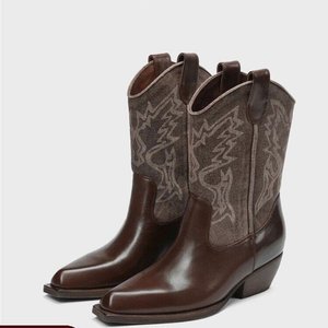 蔡文静同款尖头粗跟西部牛仔靴女2025年秋冬季拼色复古风短靴百搭