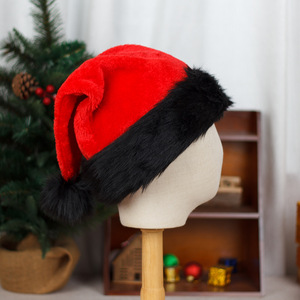 厂家直销圣诞节装饰品长毛绒帽子黑色毛绒帽圣诞老人帽红黑圣诞帽