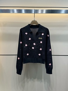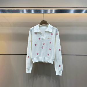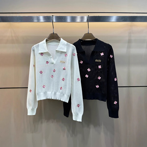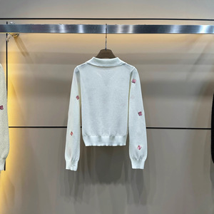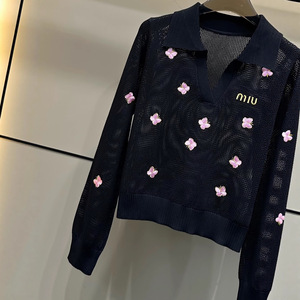 mm25早秋新款粉色刺绣小蝴蝶镂空翻领长袖上衣
