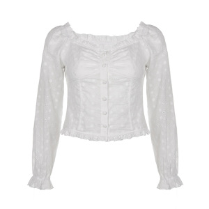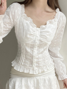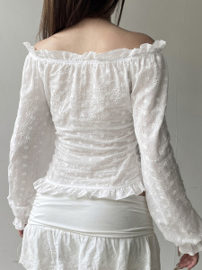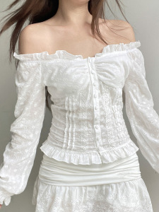恋恋布忘纯欲辣妹风蕾丝花边拼接长袖T恤肌理感一字肩收腰上衣