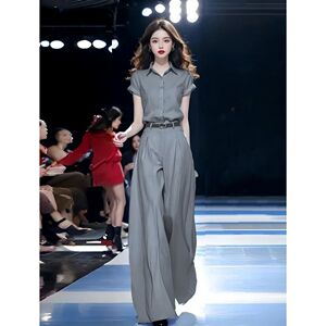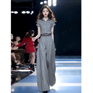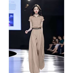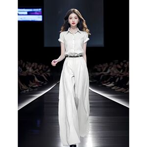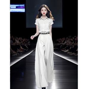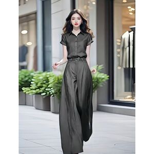 单/套装女2025夏季新款时尚显瘦短袖衬衫+高腰拖地阔腿裤子两件套