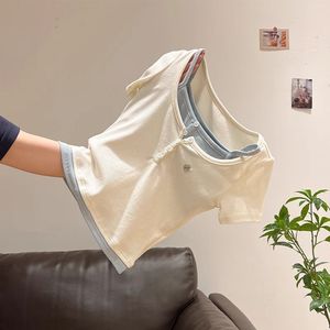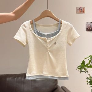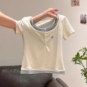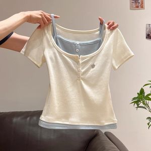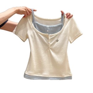 夏季别致漂亮纯欲韩版撞色假两件拼接半开领短袖T恤女绝美小上衣