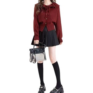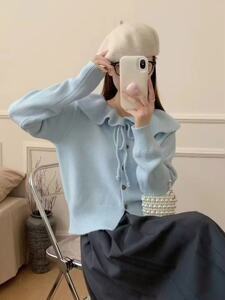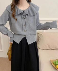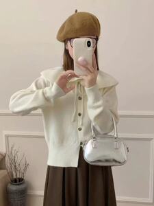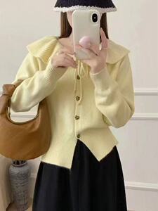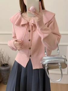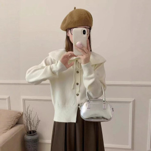 法式秋冬新款休闲温柔风娃娃领针织开衫女小众设计感宽松毛衣外套