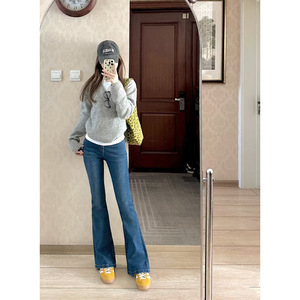 代嘉*儿同款,2025早秋款四面弹高腰微喇裤修身显瘦显高深蓝色牛
