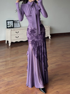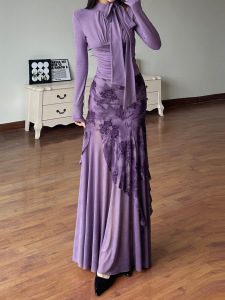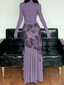 复古紫色花卉印花不规则网纱半身裙女气质低腰褶皱遮胯包臀长裙