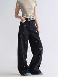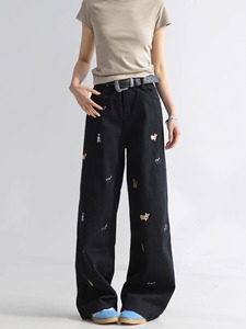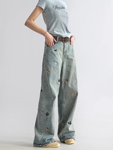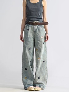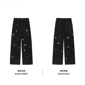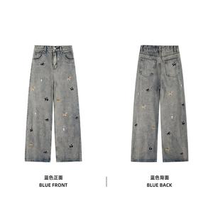趣味小狗刺绣牛仔裤男直筒宽松阔腿美式高街裤子潮牌痞帅复古长裤