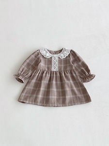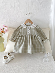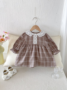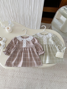 韩国童装2025秋新款女童长袖连衣裙宝宝蕾丝领格子图案连衣裙套装