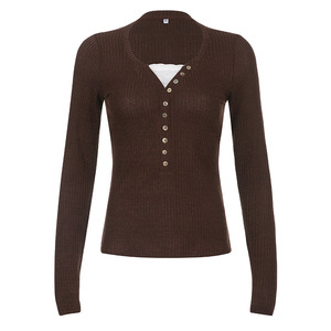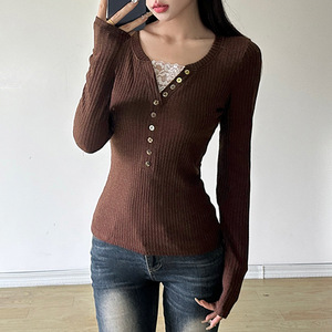 ins欧美风柔软针织弹力修身显瘦T恤复古棕色纽扣蕾丝拼接长袖上衣