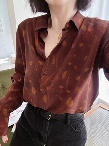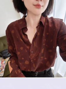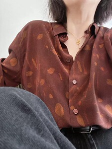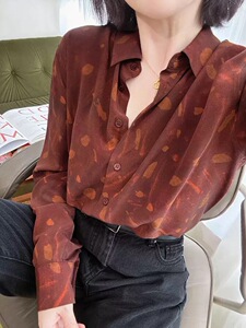 南油批发新款法式慵懒感暖调诗意晕染印花棠梨棕翻领真丝长袖衬衫