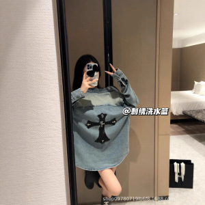 【不支持退货】CH系列高街重工烫钻拼色十字架牛仔衬衫高级设计感
