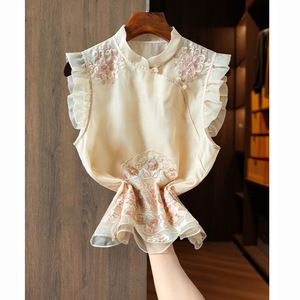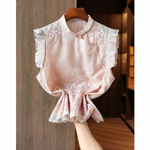 改良玉石盘扣真丝欧根纱新中式马甲背心女重工刺绣桑蚕丝国风上衣