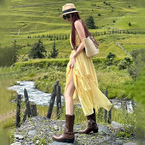 度假风黄色v领连衣裙子女夏2025新款法式气质高级感显瘦绝美长裙