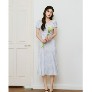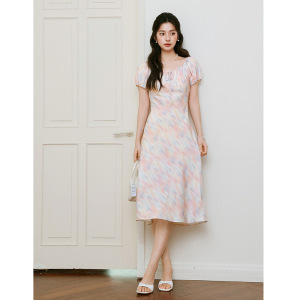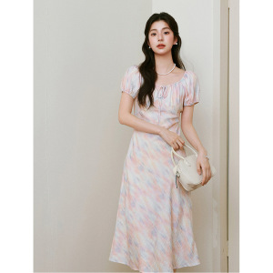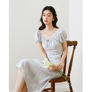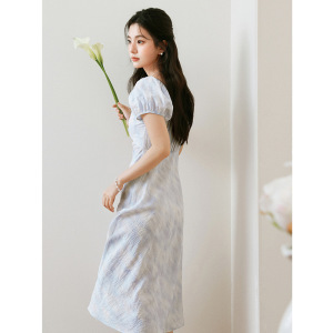 泡泡袖收腰长裙2025夏新款短袖莫奈裙欧若风度假连衣裙7G3290721