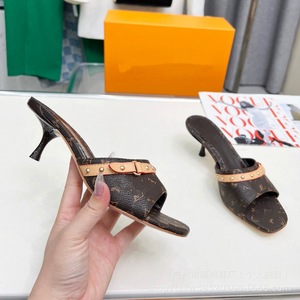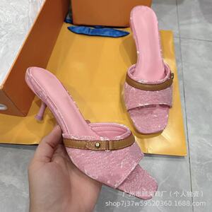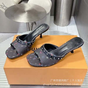 2025新款细跟牛仔布拖鞋时尚百搭拼色外穿凉鞋一字带露趾印花凉鞋
