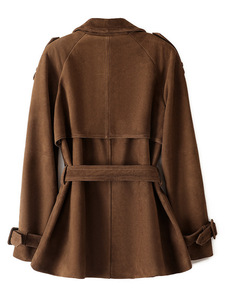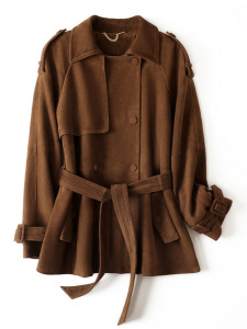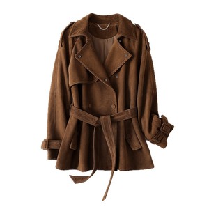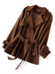 4268真皮皮衣山羊皮反绒翻领双排扣系带收腰中长款韩系风衣外套女