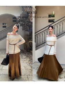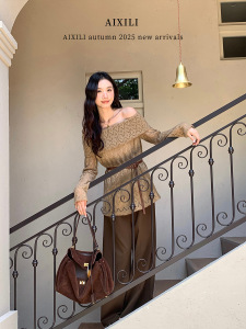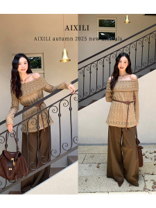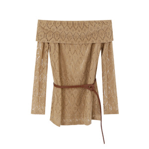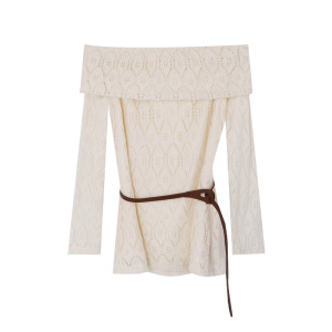 爱西里2025秋简约设计感镂空气质一字肩通勤小衫(带腰带)15291