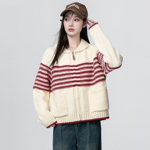 韩系翻领超好看条纹毛衣外套女秋冬大码胖mm慵懒风宽松针织衫上衣