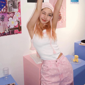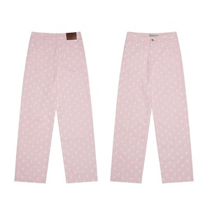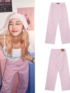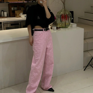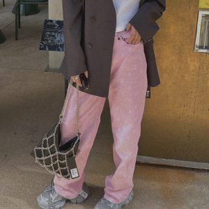 韩国小众秋季新RR粉色满印牛仔裤jennie同款直筒阔腿裤休闲长裤女