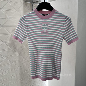 条纹撞色圆领短袖针织衫 复古少女风减龄百搭套头上衣夏季CT80509