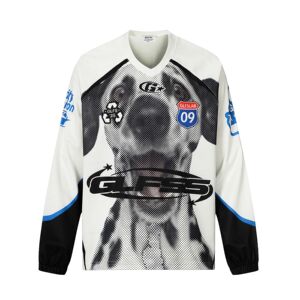 美式潮牌小狗印花V领撞色长袖T恤男秋季宽松休闲运动网眼情侣上衣