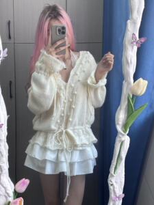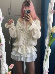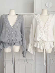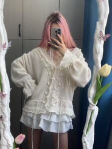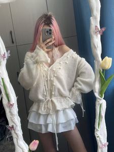 YS慵懒风短版毛球羊毛外套女秋季新款薄款绑带镂空针织衫宽松开衫