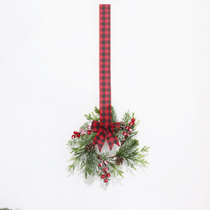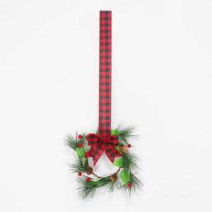 仿雪圆松针红果松果红黑格子蝴蝶结挂环