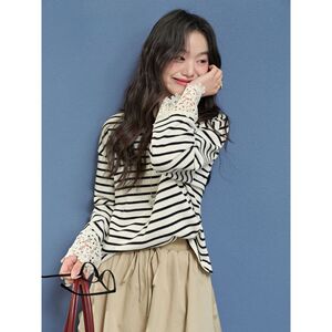 新中式条纹长袖T恤女2025春季新款内搭打底衫设计感蕾丝花边上衣