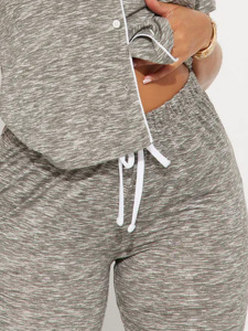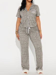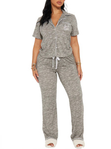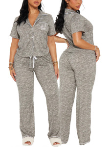 欧美跨境秋休闲2025女装翻领前开襟短袖上衣舒适家居抽绳长裤套装